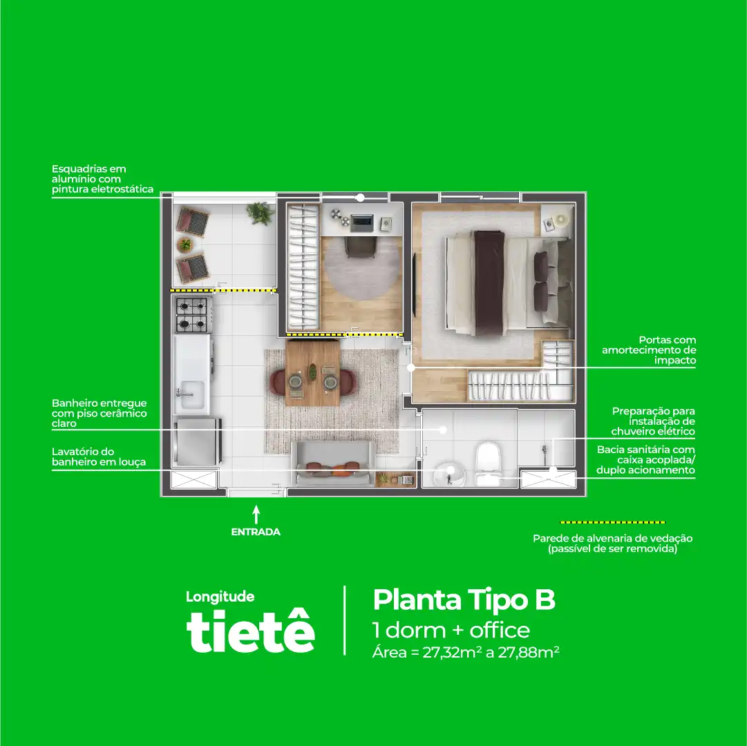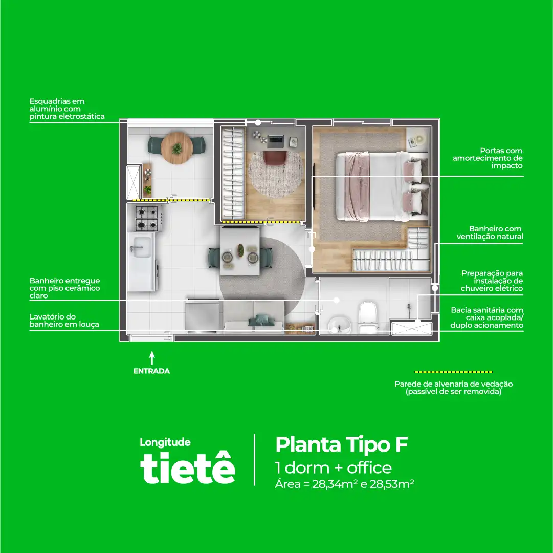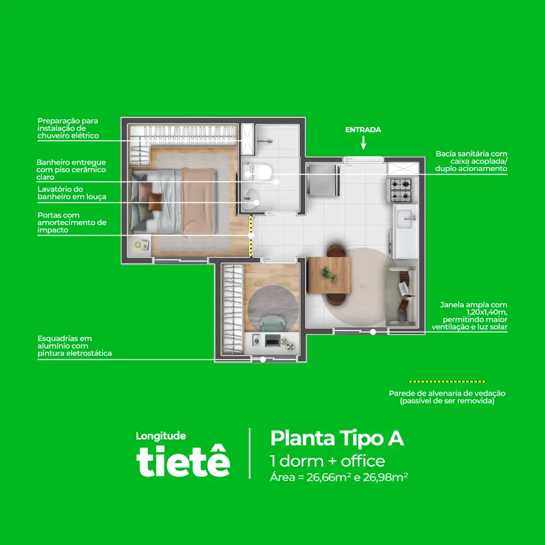 São 337 unidades distribuídas em duas torres, com tipologias que vão de studios funcionais a plantas de 1 dorm+office, que pode virar home office, closet, espaço gamer, ateliê ou o que mais combinar com você.